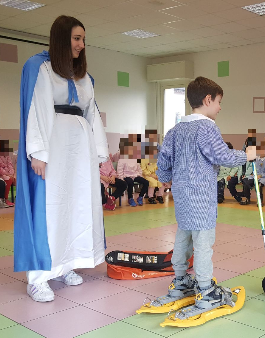 Martedì 16 Gennaio la Fata Colorina è tornata a trovarci! E’ arrivata con una slitta e veniva da lontano, era tutta infreddolita. Aveva un bellissimo mantello azzurro pieno di cristalli di neve e lo scatolone magico che ci ha portato era pieno di sorprese (ciaspole per camminare sulla neve, guanti, sciarpa e berretto, libri, giacche e doposci) e fiocchi di neve! Ci ha portato l’inverno!!